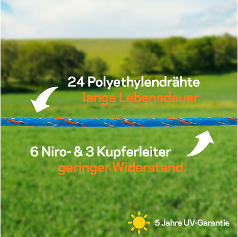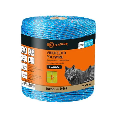Die seit Jahren in der Praxis bewährte Weidezaunlitze von Gallagher - TurboLine Vidoflex 9. Die 6 Edelstahldrähte (0,15 mm), 24 Polyethylendrähte (0,25 mm) und 3 verzinnten Kupferdrähte (0,25 mm) gewährleisten einen sicheren Stromfluss. Dadurch wird eine 40-fach bessere Leitfähigkeit, als z.B. mit Standardlitzen erreicht. Diese Vidoflex 9 TurboLine Plus Ausführung ist 50 % reißfester, dehnt sich nicht aus und ist sehr gut sichtbar. Einfach aufzuwickeln, somit ideal zur Verwendung mit einer Haspel. Diese blaue Litze ist geeignet für lange, mobile Einzäunungen z.B. Rotwild und wurde speziell entwickelt zum Abwehren von Wildschweinen und Wölfen. Studien belegen, dass Wildschweine schlecht sehen und vorwiegend Blau wahrnehmen.