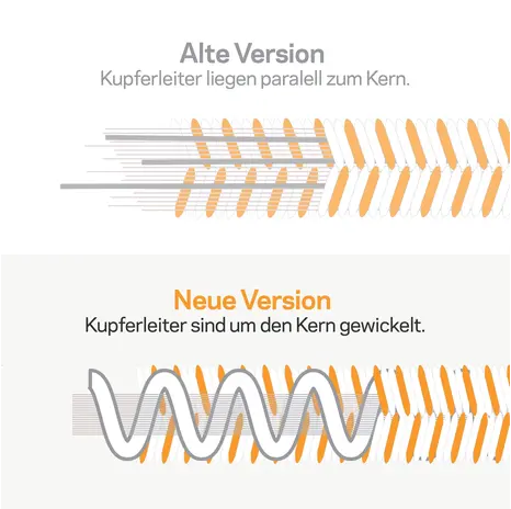 In der verbesserten Version liegen die Kupferleiter nicht mehr gerade entlang des Kerns, sondern sind um ihn herum gewickelt. Dadurch ergibt sich eine größere Kontaktfläche mit den äußeren Edelstahldrähten und eine noch bessere Leitfähigkeit, da mehr Kupfer im Draht vorhanden ist und die drei Kupferdrähte ineinander verschlungen sind. Außerdem ist die Kunststoffseele der Litze nun die gleiche wie die der Außenseite, was zu noch einer höheren Haltbarkeit führt.