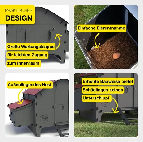 Innen überzeugt der Stall mit durchdachtem Komfort: Zwei Sitzstangen und zwei Legenester bieten ausreichend Rückzugs- und Ruheplätze. Die große Wartungsklappe erleichtert Ihnen die Reinigung und den täglichen Zugang.