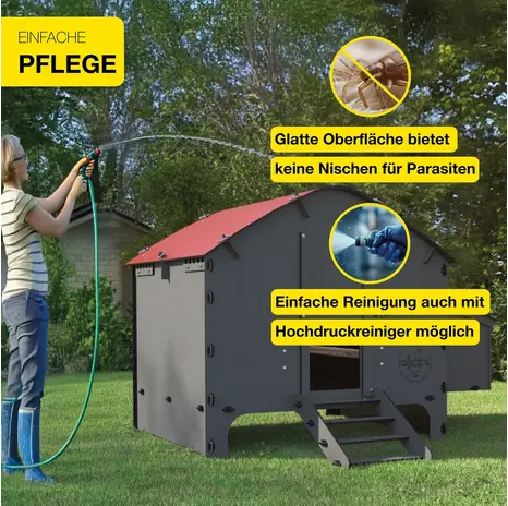 Im Gegensatz zu Holzställen lässt sich der Harmony ganz einfach mit Wasser reinigen – sogar mit dem Hochdruckreiniger! Keine versteckten Ecken für Milben, keine aufwendige Pflege. Ein Pluspunkt für Ihre Hühner und Ihre Freizeit.