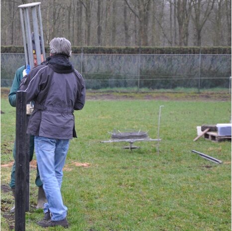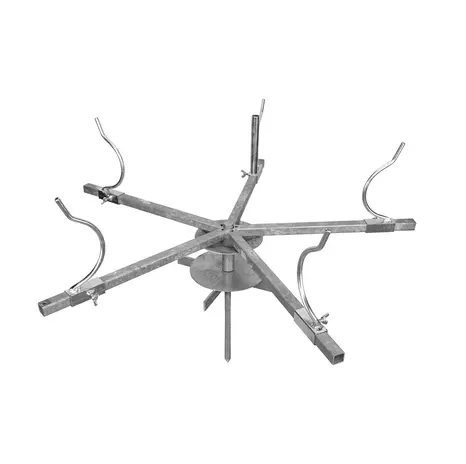 Die Drahthaspel besteht aus Grundelement mit massivem Erdnagel, drehbarem Oberteil mit 5 Auslegern sowie 5 verstellbaren Aufsätzen.