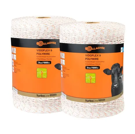 Die seit Jahren in der Praxis bewährte Weidezaunlitze von Gallagher - TurboLine Vidoflex 9. Die 6 Edelstahldrähte (0,15 mm), 24 Polyethylendrähte (0,25 mm) und 3 verzinnten Kupferdrähte (0,25 mm) gewährleisten einen sicheren Stromfluss. Dadurch wird eine 40-fach bessere Leitfähigkeit, als z.B. mit Standardlitzen erreicht. Diese Vidoflex 9 TurboLine Plus Ausführung ist 50 % reißfester, dehnt sich nicht aus und ist sehr gut sichtbar. Einfach aufzuwickeln, somit ideal zur Verwendung mit einer Haspel. Die Litze ist geeignet für lange, mobile Einzäunungen für z.B. Rinder, Schafe, Ziegen und Rotwild.