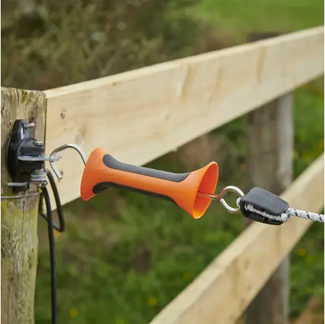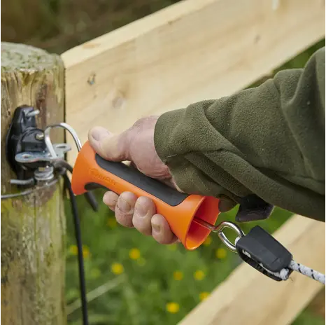 Der isolierte, UV-beständige Kunststoff- und Gummigriff ermöglicht ein sicheres Öffnen und Schließen von elektrischen Toren mit mit Bungy, Seil oder Litzen.