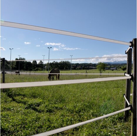 Ein reißfestes, sehr leitfägiges Gallagher PowerLine-Weidezaunband (Breitband) für kurze, mobile Pferdezäune. Es bietet eine ausgezeichnete Sichtbarkeit und ist besonders stabil. Garantierte Stromversorgung auf der gesamten Länge des Zaunes dank ausgezeichneter Leitfähigkeit.