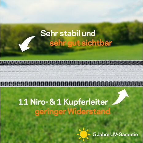 Das Breitband ist mit 11 x 0,20 Niro-Leitern sowie 1 x 0,25 Kupferleitern (verzinnt) ausgestattet. Der UV-beständige Kunststoff aus PE-Monofilen und die hochwertige Verarbeitung garantieren einen langlebigen und robusten Zaun. Durch die Farbe (weiß) fügt sich das Breitband sehr gut in die Umgebung ein.