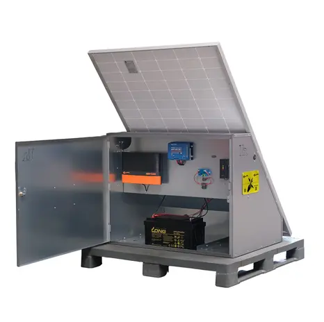 In diesem Paket ist das Weidezaungerät MBS1000i in einem diebstahlsicheren Gehäuse montiert, welches selbst auch unter Strom steht, sobald die Tür geschlossen ist und per Zusatzschlüssel elektrifiziert wurde. Das macht den Diebstahl Ihres Weidezaungerätes und des Zubehörs fast unmöglich. Dieses Set enthält außerdem eine Gel-Batterie, die an ein am Gehäuse montiertes 370 Watt Solarmodul angeschlossen ist. Ebenso ist das i Series App Gateway in der Box installiert. So haben Sie alles, was Sie für die Einzäunung benötigen, sicher in einer Station.