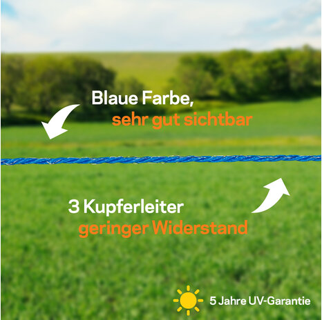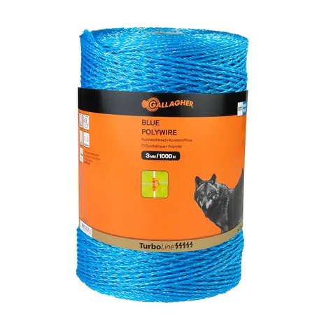 Die seit Jahren in der Praxis bewährte, blaue Weidezaunlitze von Gallagher - TurboLine. Die 3 verzinnten Kupferdrähte (0,25 mm) und 21 Polyethylendrähte (0,38 mm) gewährleisten einen sicheren Stromfluss. Dieser blaue Gallagher Kunststoffdraht wurde speziell entwickelt zum Abwehren von Wild, insbesondere Wildschweinen und Wölfen. Studien belegen, dass Wildschweine schlecht sehen und vorwiegend Blau wahrnehmen.