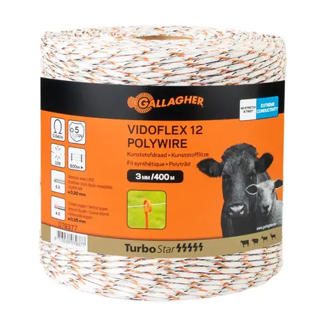 Die seit Jahren in der Praxis bewährte Weidezaunlitze von Gallagher - TurboStar Vidoflex 12. Die 6 Edelstahldrähte (0,20 mm), 26 Polyethylendrähte (0,28 mm) und 4 verzinnten Kupferdrähte (0,25 mm) gewährleisten einen sicheren Stromfluss. Dadurch wird eine 40-fach bessere Leitfähigkeit, als z.B. mit Standardlitzen erreicht. Diese Vidoflex 12 TurboStar Ausführung ist 50 % reißfester, dehnt sich nicht aus und ist sehr gut sichtbar. Einfach aufzuwickeln, somit ideal zur Verwendung mit einer Haspel. Die Litze ist geeignet für lange, mobile Einzäunungen für z.B. Rinder, Schafe, Ziegen und Rotwild.