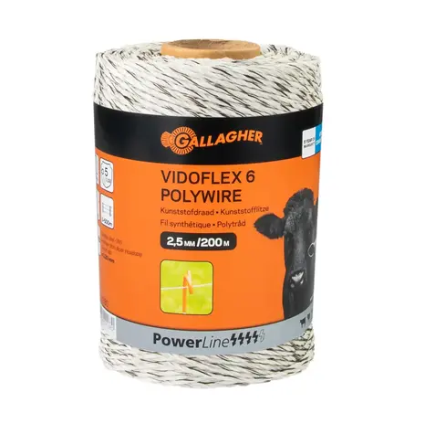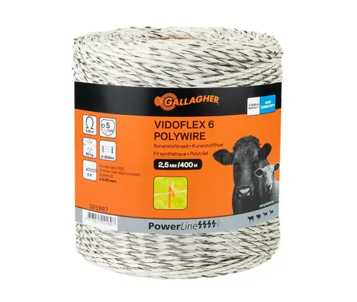 Die seit Jahren in der Praxis bewährte Weidezaunlitze von Gallagher - PowerLine Vidoflex 6. Die 6 Edelstahldrähte (0,20 mm) und 18 Polyethylendrähte (0,30 mm) gewährleisten einen sicheren Stromfluss, so dass kleine und leicht zu hütende Tiere sicher eingezäunt werden können. Durch die Farbe (weiß) fügt es sich sehr gut in die natürliche Umgebung ein und ist zeitgleich gut sichtbar. Einfach aufzuwickeln, somit ideal zur Verwendung mit einer Haspel. Die Litze ist geeignet für kurze, mobile Einzäunungen für z.B. Rinder, Schafe, Ziegen und Rotwild.