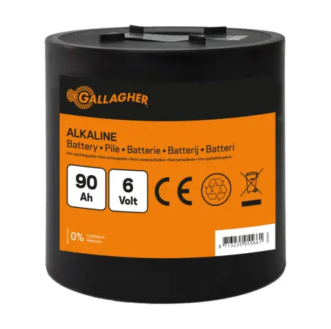Runde 6V 90Ah Alkaline-Weidezaunbatterie als Speisung für ein 6V Batteriegerät. Frei von Quecksilber und Cadmium – umweltfreundlich.
