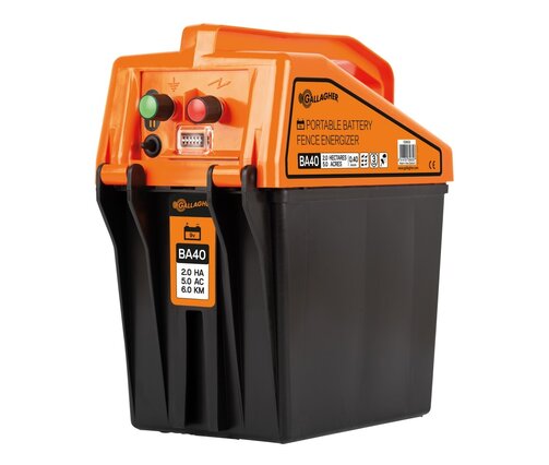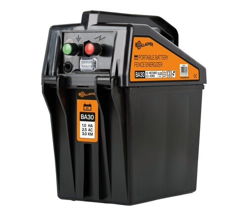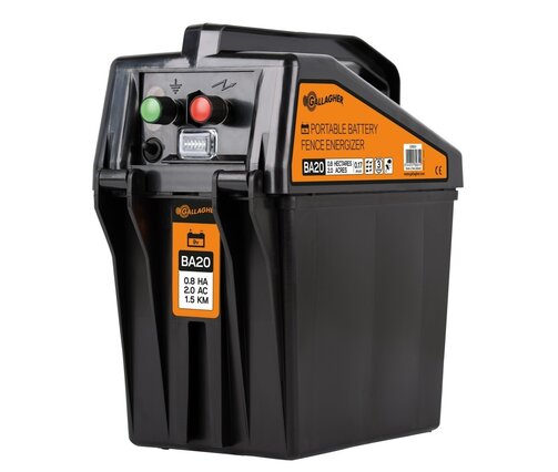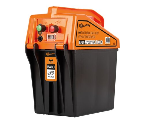 Die 9V-Weidezaungeräte von Gallagher sind runderneuert worden. Dabei handelt es sich ausnahmslos um leistungsstarke Batteriegeräte, die einfach zu bedienen und robust ausgelegt sind und die Qualität aufweisen, die Sie von Gallagher erwarten dürfen. Das Modell BA80 besitzt ein schwarzes Gehäuse mit orangefarbenem Deckel. Dieses Gerät ist mit einem Energiesparmodus ausgestattet, somit hält die Batterie länger, da das Gerät verzögerte Impulse aussendet und die Impulsstärke wechselt. Das Lämpchen auf dem Weidezaungerät zeigt den Impuls der Batterie an. Das Weidezaungerät BA80 eignet sich für größere (mobile) Zäune. Dieses Weidezaungerät wird mit einem Anschlusskabelset für Batterie geliefert (Akkukabel separat erhältlich, Artikel-Nr.: 005499). Eine Batterie (210 Ah) reicht um das Gerät ca. 90 Tage betreiben zu können.