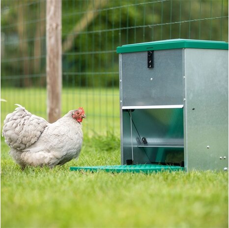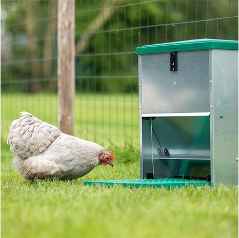 Aufgrund der hohen Empfindlichkeit des Pedals ist dieser Futterautomat für alle Enten-, Hühner und Fasanarten geeignet. Er bietet umfangreiche Möglichkeiten um das Gewicht einzustellen, das die Futterklappe öffnet. Dies ist abhängig von der Geflügelart. Das minimal einstellbare Gewicht beträgt 250 g und das maximale Gewicht 2 kg.