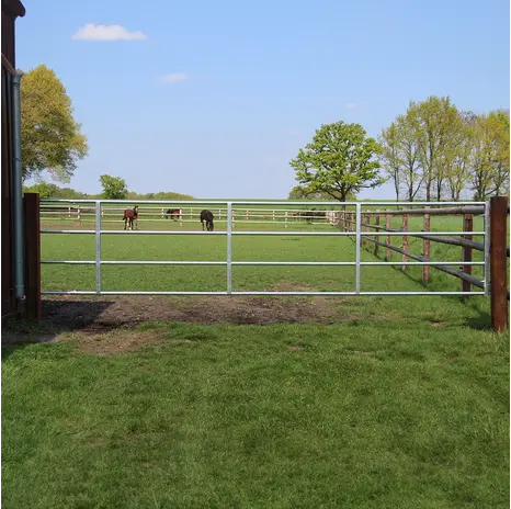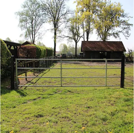 Dank des lichten Rohrabstands von 32 cm und einem kleinstmöglichen Abstand zur Mittelstrebe von 30 cm, bietet das Tor zudem eine gute Sicht auf die dahinter liegenden Felder, Weiden und Tiere. Darüber hinaus zeichnen sich diese Tore durch C-Profile mit waagerecht eingeschweißten Rundrohren aus.