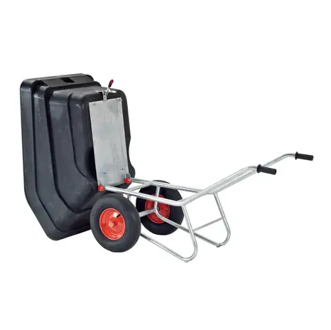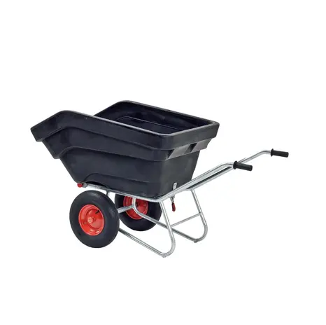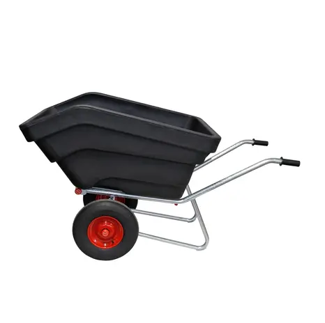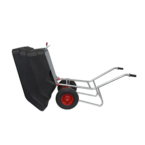 Die besonderen Eigenschaften dieser Karre liegen in ihrer robusten Bauweise und ihrem großen Fassungsvermögen. Die kippbare, schwarze PE-Mulde ist besonders widerstandsfähig, während das feuerverzinkte Untergestell für hohe Stabilität und Langlebigkeit sorgt.