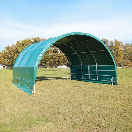 Dieses Growi® Rundbogen-Weidezelt besteht aus 6 Panels, einer Dachkonstruktion, einer PES-Gewebeplane (aus UV-beständige Hochleistungs-Plane (650 g/m²) in grün), feuerverzinkten Ratschen und Abspannrohren.