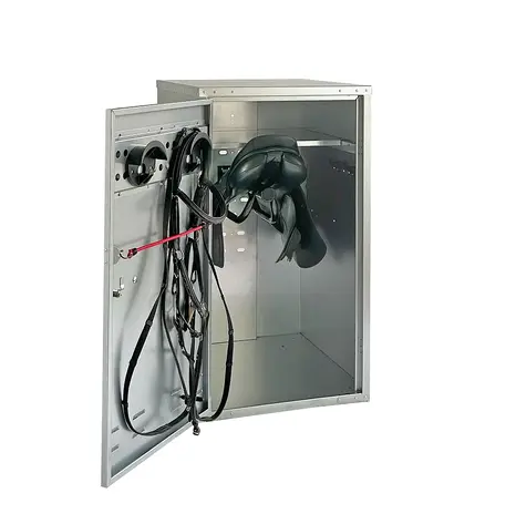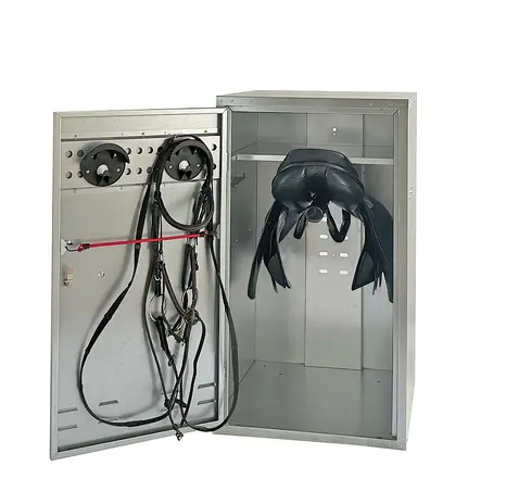 Original Growi® Sattelschrank mit verstellbarem Einlegeboden, zwei Sattelhaltern und zwei Trensenhaltern. Sehr flexibel durch verstellbare Haken und Expander für Trensen.