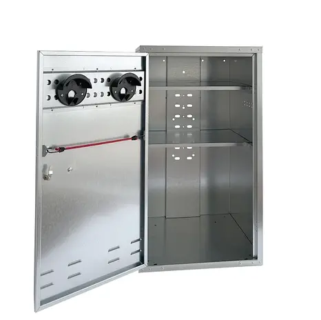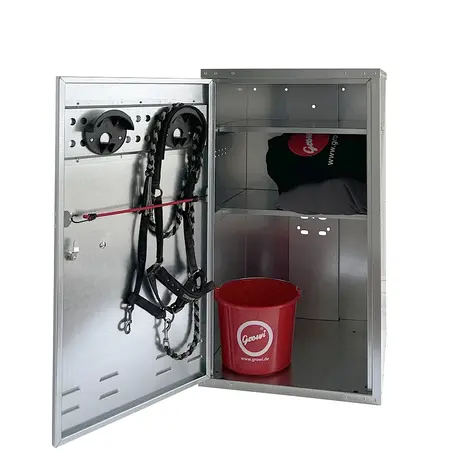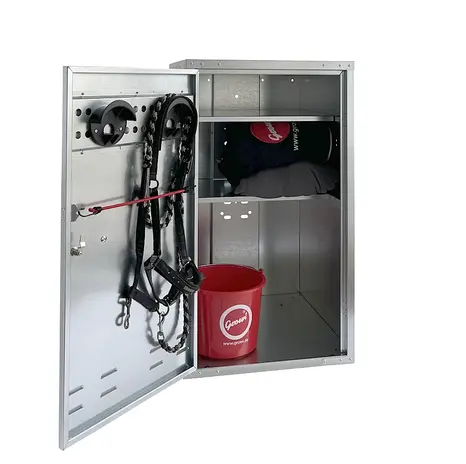 Original Growi® Universalschrank mit zwei Einlegeböden und zwei Trensenhaltern. Mit doppelt umgelegten Kanten und mit einem stabilem Kunststoff-Handgriff ausgestattet.