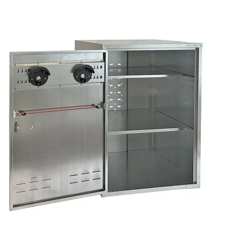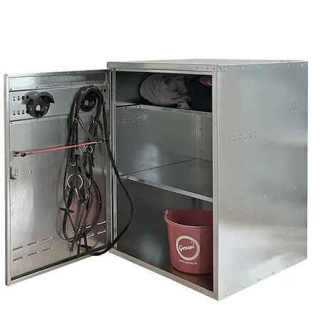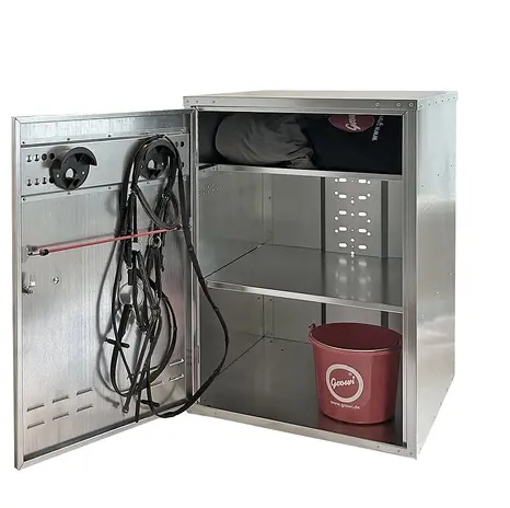 Original Growi® Universalschrank mit zwei Einlegeböden und zwei Trensenhaltern. Mit doppelt umgelegten Kanten und mit einem stabilem Kunststoff-Handgriff ausgestattet.