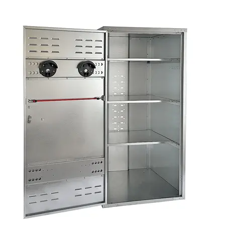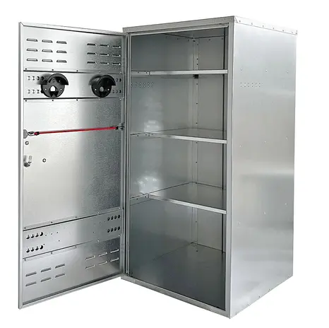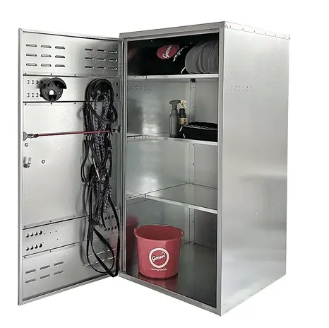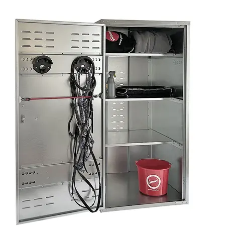 Original Growi® Universalschrank mit drei Einlegeböden und zwei Trensenhaltern. Mit doppelt umgelegten Kanten und mit einem stabilem Kunststoff-Handgriff ausgestattet.