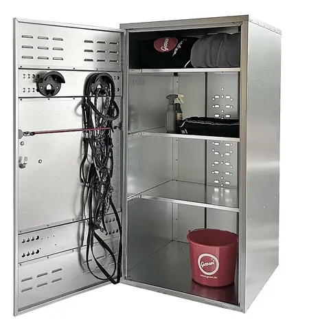 Der Original Growi® Universalschrank bieten nicht nur Platz, sondern ist ein kleines Organisationswunder: Hier ist genug Raum für Zubehör wie Trensen und Bürsten – auf kleinstem Raum, gut geschützt und sicher. Neben der großen Auswahl erkennen Sie die Original Growi® Sattelschränke an den folgenden Details: