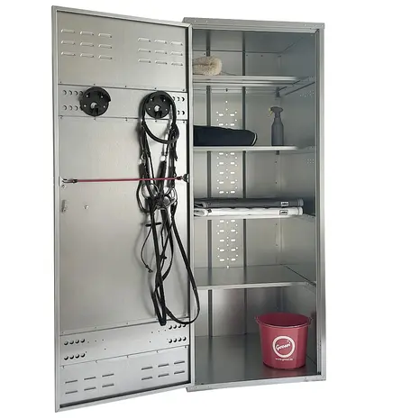 Original Growi® Universalschrank mit vier Einlegeböden und zwei Trensenhaltern. Mit doppelt umgelegten Kanten und mit einem stabilem Kunststoff-Handgriff ausgestattet.