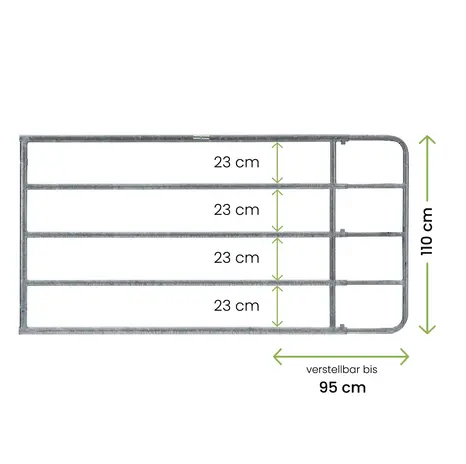 Eine der besonderen Funktionen ist die ausziehbare Konstruktion. Sie können das Tor um ungefähr 1 Meter erweitern, was es besonders flexibel für verschiedene Gegebenheiten und Anforderungen macht. Mit der Gesamthöhe von 110 cm und einem Rohrdurchmesser von 1¼" bietet es die erforderliche Robustheit, um verschiedenen Tierarten wie Pferden und Rindern standzuhalten.