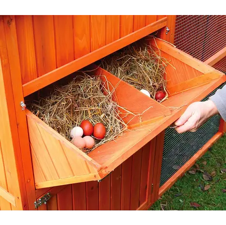 Das Legenest verfügt über eine Klapptüre, die das Einsammeln der Eier vereinfacht und sicher macht. Das Hühnerhaus Norway besitzt eine geräumige Außenvoliere, in der die Tiere in vollständiger Sicherheit das Freie genießen können. Sie selbst können die Voliere über eine große Zugangstür betreten, sogar ohne sich dabei bücken zu müssen.