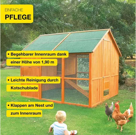 Die artgerechte Haltung Ihrer Hühner erfordert viel Platz. Ihre Hühner benötigen eine geräumige Rückzugsmöglichkeit - sicher geschützt vor Fressfeinden und Witterungseinflüssen, sowie ein weitläufiges Freilaufgehege für den täglichen Auslauf.