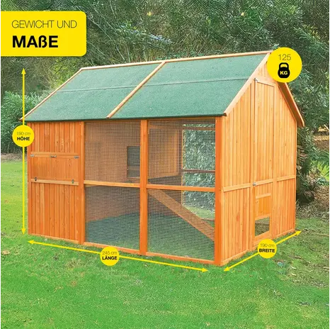 - Maße des geschlossenen Innenraums, einschließlich Nester: 73 x 173 cm (inkl. der 4 Sitzstangen)