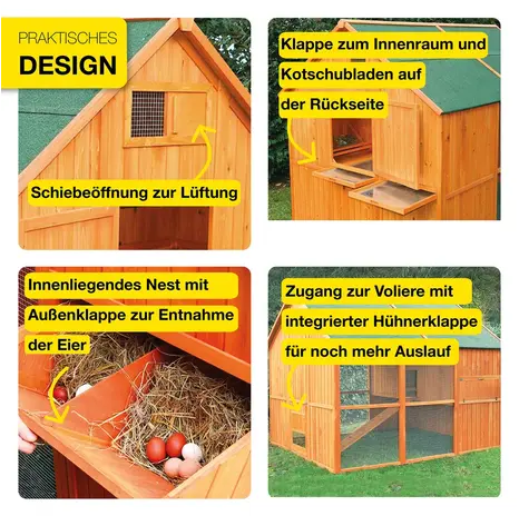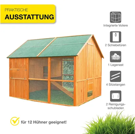 Der Hühnerstall Norway mit integrierter Voliere eignet sich für 10 bis 12 Hühner. Das äußerst geräumige Hühnerhaus besteht aus einem weitläufigen, warmen und erhöht angebrachten Unterschlupf, der über eine Rampe zugänglich ist. Das Hühnerhaus ist ausgestattet mit Sitzstangen und einem Legenest. Der Unterschlupf ist über eine Tür von außen zugänglich, welche eine einfache und schnelle Reinigung ermöglicht.