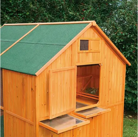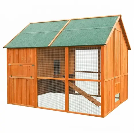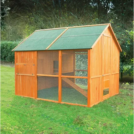 Eine Kopfseite der Voliere besteht aus Holz, dies schützt optimal vor Zugluft. Das Hühnerhaus Norway besteht aus behandeltem Holz, sein Dach ist vollständig mit geteertem Tuch überzogen.