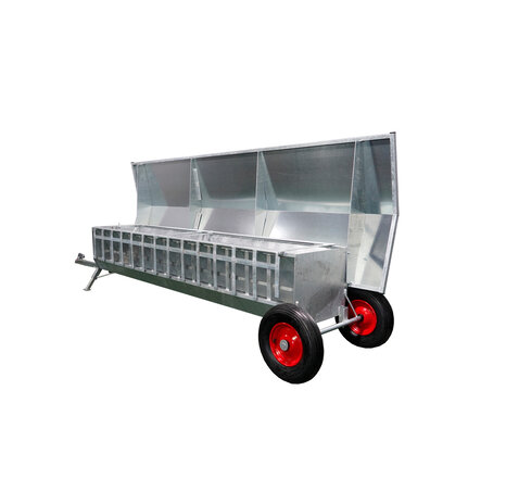 Mobil und flexibel: Ausgestattet mit 2 luftbereiften Rädern und einer Anhängekupplung lässt sich der Automat mühelos von der Weide zur Futterstelle transportieren.