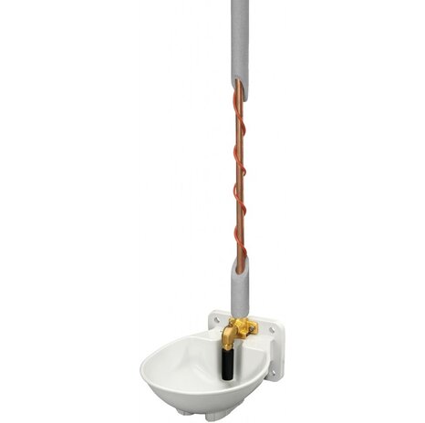 Beheizt werden Tränkeschale, Ventil und bis zu 2 Meter Rohrleitung (min. 1 Meter, max. 2 Meter) durch ein 230 Volt Heizkabel (66 Watt). Das integrierte Frostschutz-Thermostat schaltet das Kabel bei ca. 5°C ein und bei ca. 15°C wieder aus. Dadurch bleiben Tränkeschale und Ventil bis zu ca. -35°C frostfrei.