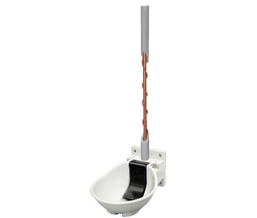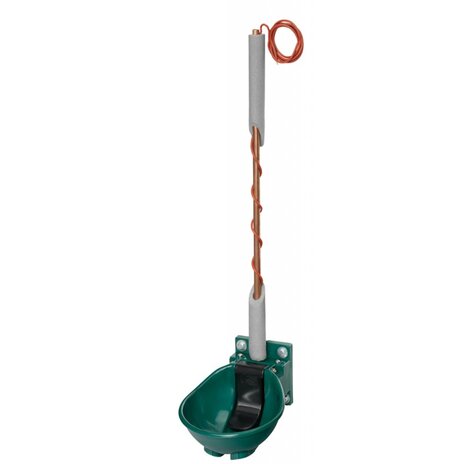 Beheizt werden Tränkeschale, Ventil und bis zu 2 Meter Rohrleitung (min. 1 Meter, max. 2 Meter) durch ein 230 Volt Heizkabel (54 Watt). Das integrierte Frostschutz-Thermostat schaltet das Kabel bei ca. 5°C ein und bei ca. 15°C wieder aus. Dadurch bleiben Tränkeschale und Ventil bis zu ca. -20°C frostfrei.
