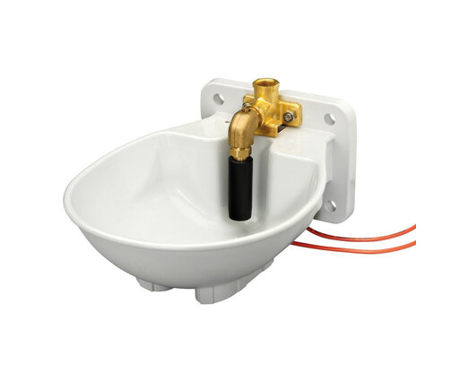Beheizt werden Tränkeschale und Ventil durch ein 230 Volt Heizkabel (45 Watt). Das integrierte Frostschutz-Thermostat schaltet das Kabel bei ca. 5°C ein und bei ca. 15°C wieder aus. Dadurch bleiben Tränkeschale und Ventil bis zu ca. -20°C frostfrei.