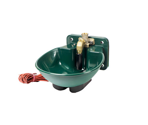 Beheizt werden Tränkeschale und Ventil durch ein 24 Volt Heizkabel (45 Watt). Das integrierte Frostschutz-Thermostat schaltet das Kabel bei ca. 5°C ein und bei ca. 15°C wieder aus. Dadurch bleiben Tränkeschale und Ventil bis zu ca. -35°C frostfrei. TRAFO ERFORDERLICH
