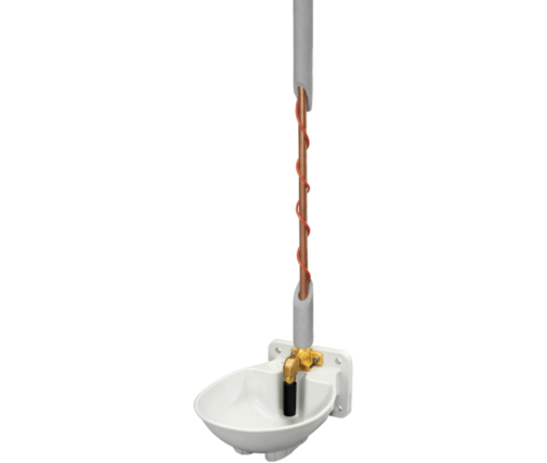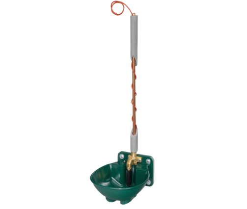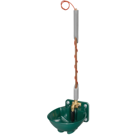 Beheizt werden Tränkeschale, Ventil und bis zu 2 Meter Rohrleitung (min. 1 Meter, max. 2 Meter) durch ein 24 Volt Heizkabel (66 Watt). Das integrierte Frostschutz-Thermostat schaltet das Kabel bei ca. 5°C ein und bei ca. 15°C wieder aus. Dadurch bleiben Tränkeschale und Ventil bis zu ca. -35°C frostfrei.