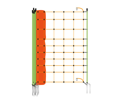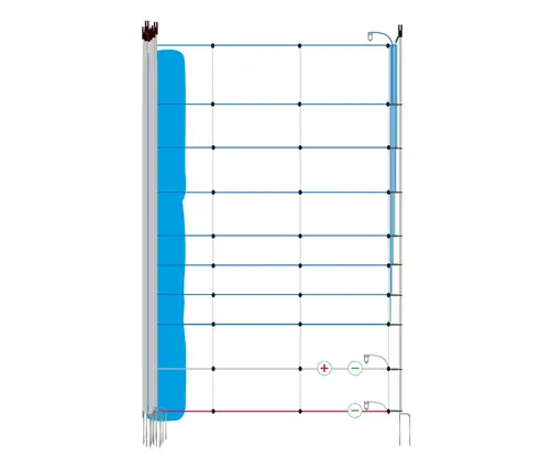 Dieses extra sichere Weidezaunnetz mit Plus-Minus-Anschluss (+/-) findet überall da Anwendung, wo es auf höchste Sicherheit ankommt. Bei einem Plus-Minus-Weidezaunnetz werden die Litzen im Netz abwechselnd mit dem Zaunanschluss (Pluspol) und dem Erdanschluss (Minuspol) des Weidezaungerätes verbunden. Berührt ein Tier gleichzeitig zwei Litzen kommt es zum Stromschlag. Der Strom fließt hierbei direkt vom Zaundraht (Pluspol) durch den Teil des Körpers, der die beiden Litzen berührt, zum Erddraht (Minuspol). Auf diese Weise bekommt das Tier direkt die Hütespannung an der berührenden Stelle zu spüren.