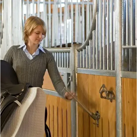 Pferdesattel ablegen die Stange einfach nach unten drücken und ablegen. Pferdesattel abnehmen einfach herunter ziehen, und die Stange klappt selbstständig durch die verbaute Feder an die Wand zurück. Damit ragt sie nie in die Stallgasse hinein und bringt mit super einfacher Handhabung das entscheidene Plus an Sicherheit in Ihre Stallgasse.
