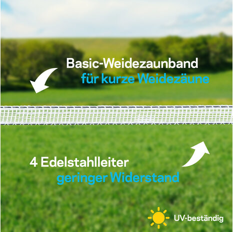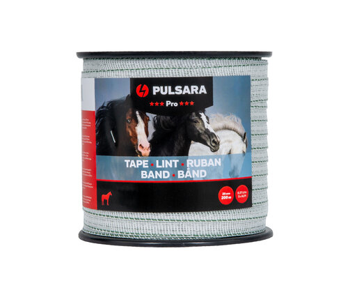 Ein reißfestes, leitfähiges Pulsara Basic Weidezaunband (Breitband) für kurze, mobile Pferde- und Ponyzäune. Es bietet eine ausgezeichnete Sichtbarkeit und ist besonders stabil. Garantierte Stromversorgung auf der gesamten Länge des Zaunes dank ausgezeichneter Leitfähigkeit. Das Breitband ist mit 4 x 0,15 Niro-Leitern ausgestattet. Der UV-beständige Kunststoff aus PE-Monofilen und die hochwertige Verarbeitung garantieren einen langlebigen und robusten Zaun. Durch die Farbe (weiß/schwarz) fügt sich das Breitband sehr gut in die Umgebung ein.