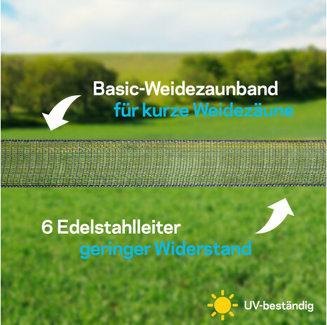 Ein reißfestes, leitfähiges Pulsara Basic Weidezaunband (Breitband) für kurze, mobile Pferde- und Ponyzäune. Es bietet eine ausgezeichnete Sichtbarkeit und ist besonders stabil. Garantierte Stromversorgung auf der gesamten Länge des Zaunes dank ausgezeichneter Leitfähigkeit. Das Breitband ist mit 6 x 0,20 Niro-Leitern ausgestattet. Der UV-beständige Kunststoff aus PE-Monofilen und die hochwertige Verarbeitung garantieren einen langlebigen und robusten Zaun. Durch die Farbe (terra) fügt sich das Breitband sehr gut in die Umgebung ein.
