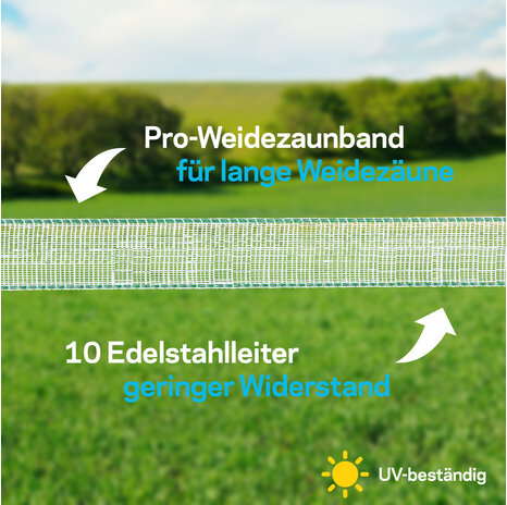 Ein reißfestes, sehr leitfähiges Pulsara Pro Weidezaunband (Breitband) für lange, permanente Pferde- und Ponyzäune. Es bietet eine ausgezeichnete Sichtbarkeit und ist besonders stabil. Garantierte Stromversorgung auf der gesamten Länge des Zaunes dank ausgezeichneter Leitfähigkeit. Das Breitband ist mit 10 x 0,28 Niro-Leitern ausgestattet. Der UV-beständige Kunststoff aus PE-Monofilen und die hochwertige Verarbeitung garantieren einen langlebigen und robusten Zaun. Durch die Farbe (weiß/grün) fügt sich das Breitband sehr gut in die Umgebung ein.