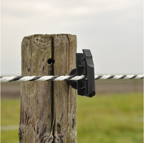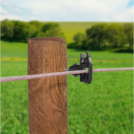 Pulsara Breitband- und Kordelisolator für Bänder bis 40 mm und Cord/Seil bis 8 mm, mit Sechskantprofil als Einschraubhilfe.