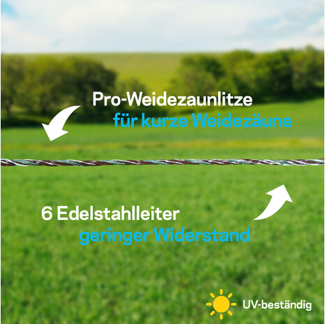 Die seit Jahren in der Praxis bewährte Weidezaunlitze von Pulsara - Pro. Die 6 Edelstahlleiter (0,28 mm) gewährleisten einen sicheren Stromfluss, so dass kleine und leicht zu hütende Tiere sicher eingezäunt werden können. Durch die Farbe (terra/grün) fügt es sich sehr gut in die natürliche Umgebung ein. Einfach aufzuwickeln, somit ideal zur Verwendung mit einer Haspel. Die Litze ist geeignet für kurze, mobile Einzäunungen für z.B. Rinder, Schafe, Wildschweine und Hunde.