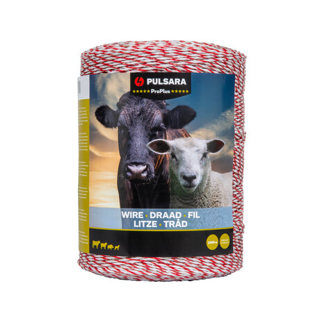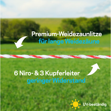 Die seit Jahren in der Praxis bewährte Weidezaunlitze von Pulsara - Pro. Die 6 Edelstahlleiter (0,15 mm) und 3 Kupferleiter (0,20) gewährleisten einen sicheren Stromfluss, so dass kleine und leicht zu hütende Tiere sicher eingezäunt werden können. Durch die Farbe (weiß/rot) fügt es sich sehr gut in die natürliche Umgebung ein. Einfach aufzuwickeln, somit ideal zur Verwendung mit einer Haspel. Die Litze ist geeignet für kurze, lange Einzäunungen für z.B. Rinder, Schafe, Wildschweine und Hunde.