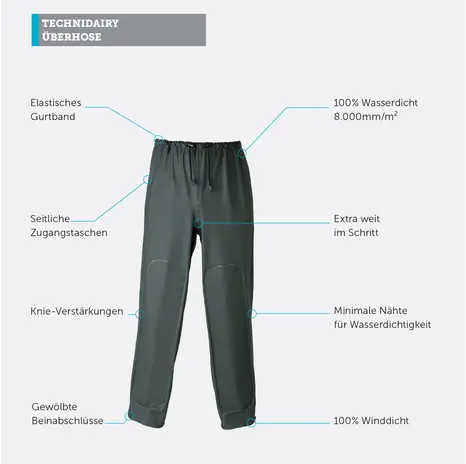 Die Technidairy-Reihe wurde so konzipiert, dass sie den Säuren und Reinigungsmitteln standhält, die bei der Reinigung von Milchviehställen verwendet werden. Diese Produktreihe ist zu 100 % wasserdicht und wird mit ultrahochfrequenzverschweißten Nähten hergestellt. Die überragende Flexibilität und Dehnbarkeit sorgen für ultimativen Komfort und Haltbarkeit.